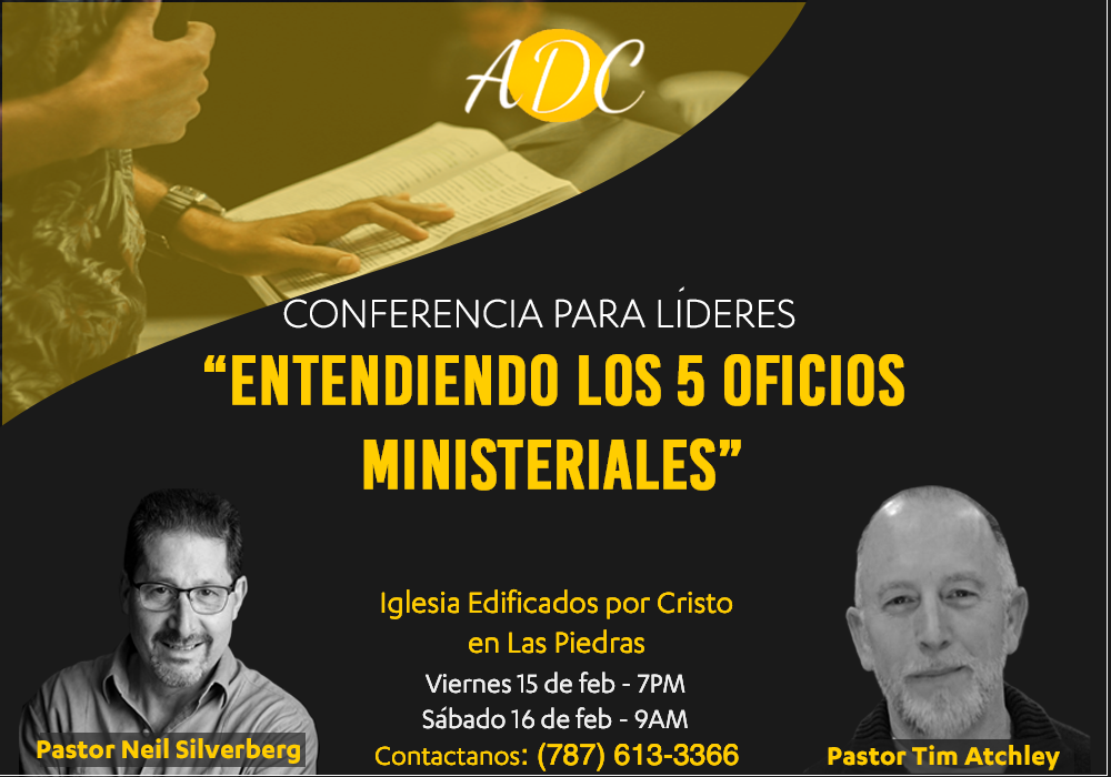 El viernes, 15 y sábado, 16 de febrero del 2019 los pastores Neil Silverberg y Tim Atchley estarán presentando una conferencia para líderes. El viernes a las 7PM el Pastor Neil Silverberg hablará sobre la importancia de los 5 oficios ministeriales. El sábado el Pastor Tim Atchley estara trayendo un mensaje para equipar a la iglesia a fin de ejercer el ministerio efectivamente. Este evento se llevará a cabo en la Iglesia Edificados por Cristo en Las Piedras, Puerto Rico y es libre de costo. si interesa almuerzo el sábado el mismo tiene un costo de $10.00. A continuación, las secciones que se llevarán a cabo: