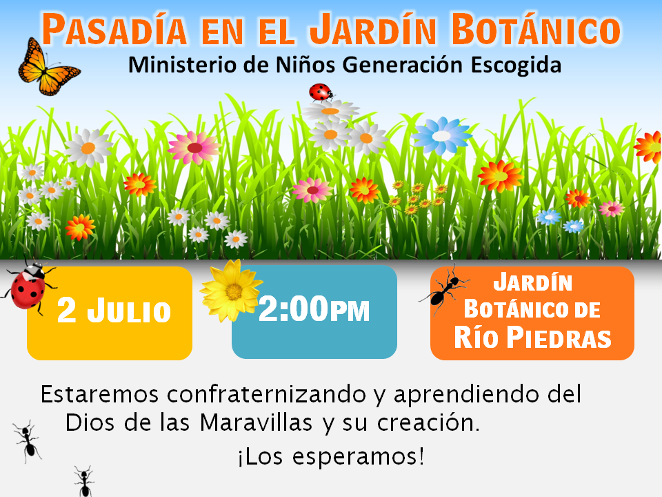 El Ministerio de Niños “Generación Escogida” presenta su pasadía de confraternización en el Jardín Botánico de Río Piedras, Puerto Rico, a celebrarse el sábado, 2 de julio de 2016. El lugar de encuentro será en la Iglesia Adoradores de Cristo (abajo encontrarás el mapa interactivo para direcciones) a las 2:00PM. Trae a tus niños para compartir en familia y aprender sobre las maravillas de la creación de Dios.