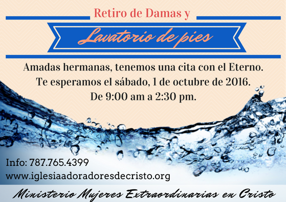 El Ministerio de Damas Mujeres Extraordinarias en Cristo presenta su Retiro de Damas. En esta ocasión, estaremos realizando un lavatorio de pies. Ven y comparte con nosotros esta experiencia que nos enseñó Jesús. Estamos seguros de que será un momento inolvidable donde el Espíritu Santo derramará de su amor y sanidad sobre nuestras vidas.